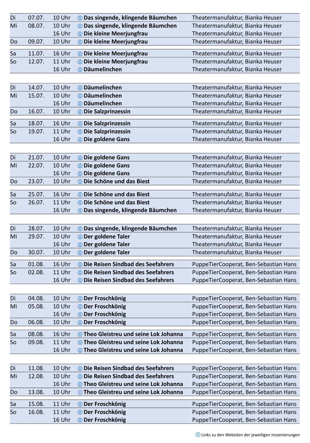In den Sommerferien freuen sich wieder viele Puppen darauf, Euch im Sonnenhäusel im Großen Garten zu einem bunten Theaterprogramm zu begrüßen.